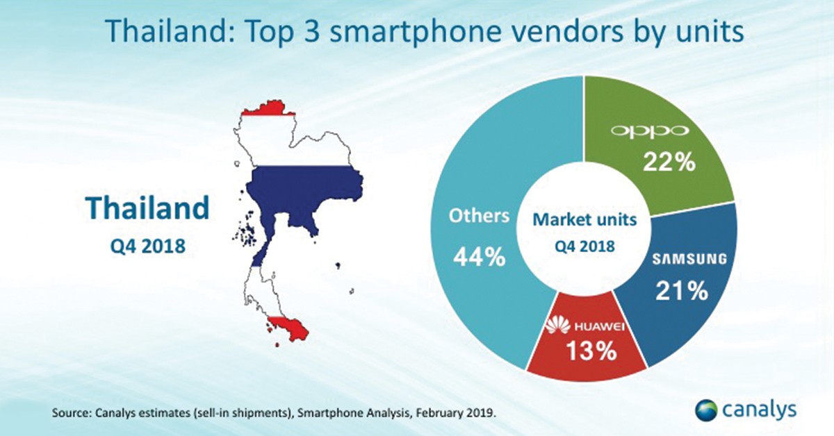 โดยตลาดสมาร์ทโฟนของประเทศไทย ที่ถือว่าเป็นตลาดใหญ่อันดับ 2 ในภูมิภาคเอเซียตะวันออกเฉียงใต้ ไตรมาส 4/2018 ที่ผ่านมา มียอดขายทั้งหมดที่ 4.9 ล้านเครื่อง เทียบกับปีก่อนในช่วงเวลาเดียวกัน มีจำนวนลดลงถึง 13.6%