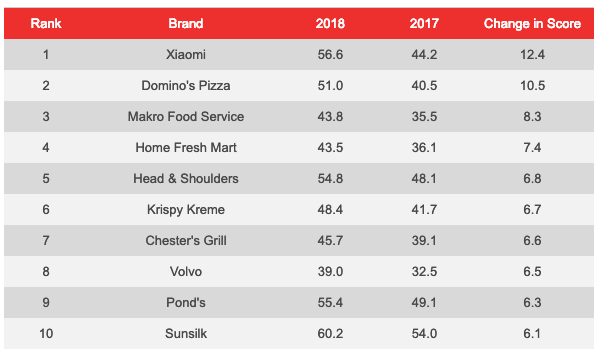 เสียวหมี่ (Xiaomi) ได้รับคะแนนแบรนด์ที่มีการบอกต่อแบบปากต่อปากเพิ่มขึ้นมากที่สุด และเป็นแบรนด์สมาร์ทโฟนแบรนด์เดียวที่ได้รับการจัดอันดับจากผลสำรวจล่าสุดของ YouGov Brand Index หน่วยงานด้านวิจัยและจัดทำผลสำรวจด้านการรับรู้แบรนด์ระดับโลก