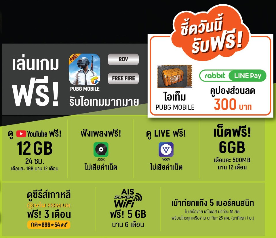 พิเศษ! สำหรับลูกค้าใหม่ AIS ZEED ที่เปิดเบอร์ใหม่ระบบเติมเงินและรายเดือน พร้อมเปิดใช้บริการ Rabbit line Pay ตั้งแต่วันนี้ – 31 พ.ค. 2562 จะได้รับคูปองส่วนลดมูลค่ารวม 300 บาท นอกจากนี้ ลูกค้าปัจจุบันและลูกค้าใหม่ สามารถกดรับไอเทมจาก PUBG Mobile ได้อีกมากมาย