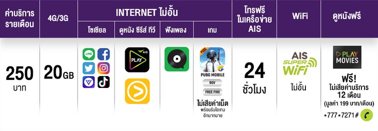 - เล่นเน็ตเต็มสปีด 20 GB (จากนั้นเล่นเน็ตต่อเนื่องด้วยความเร็ว 128 Kbps.)