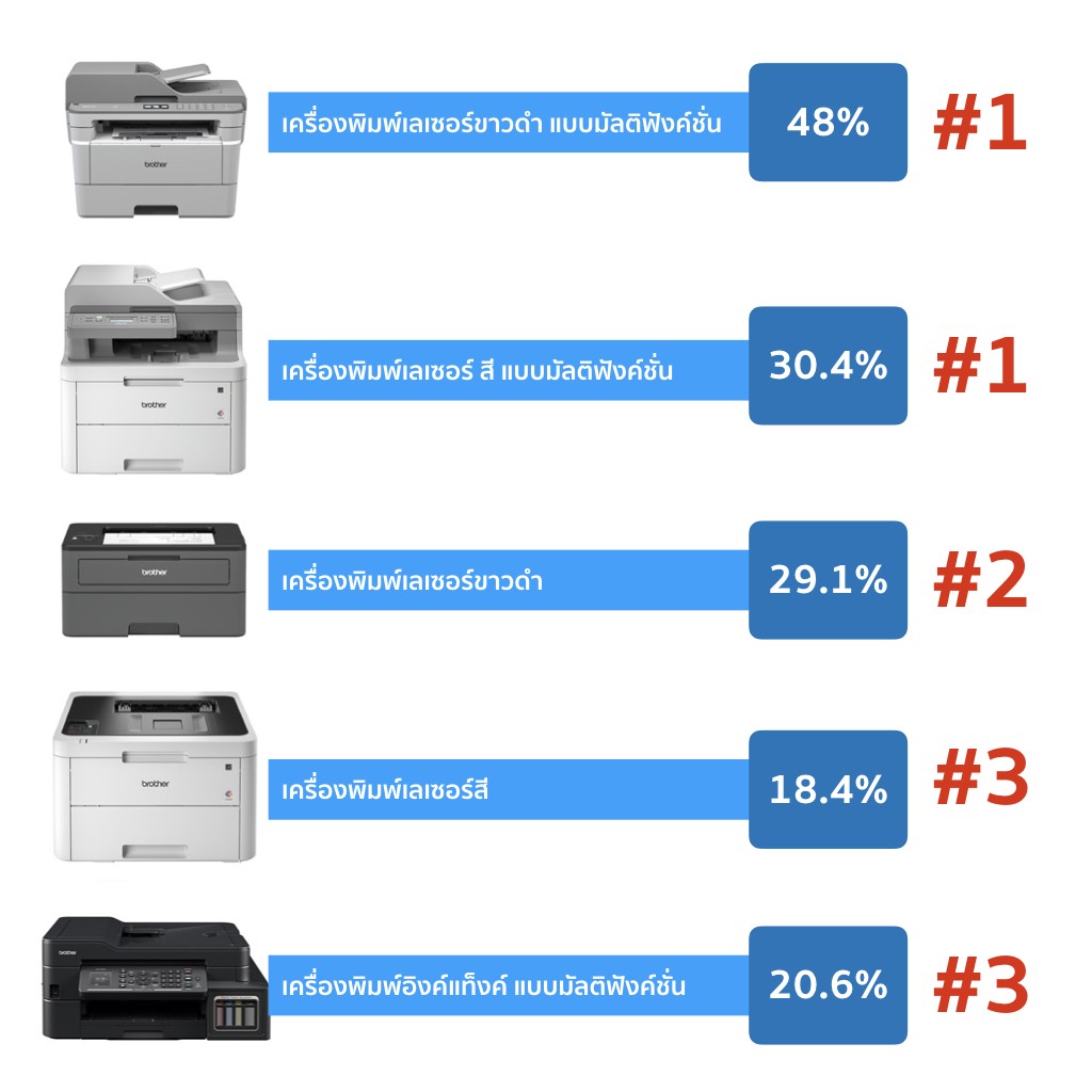 - เครื่องพิมพ์เลเซอร์ขาวดำ แบบมัลติฟังค์ชั่น (Mono-Laser Multi Function) บราเดอร์กินส่วนแบ่งการตลาด 48% เป็นอันดับที่ 1