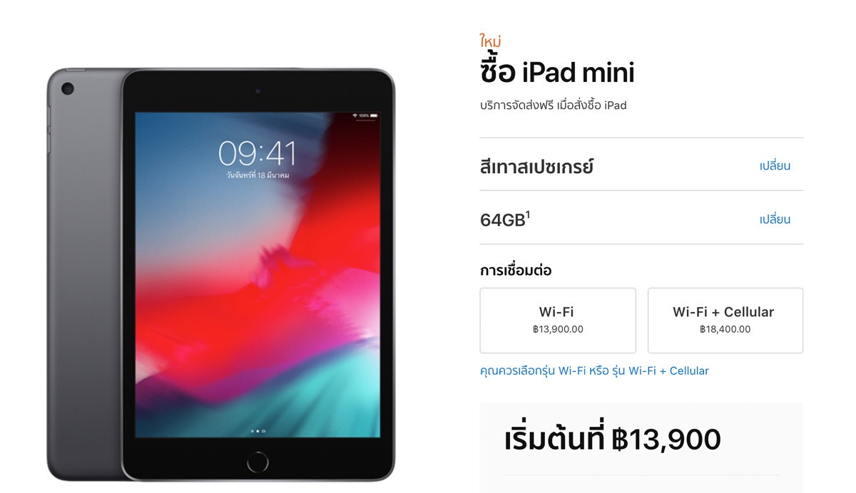- รุ่น Wi-Fi ความจุ 64GB ราคา 13,900 บาท