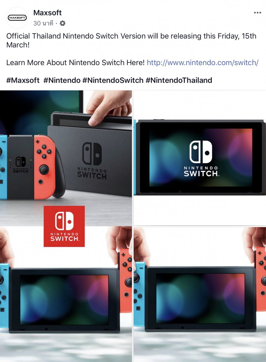 เป็นเรื่องที่มาแบบไม่มีข่าวลือมาก่อน มีการประกาศจากแฟนเพจ Maxsoft ว่า เครื่องเกม Nintendo Switch ศูนย์ไทย จะเปิดตัวในไทยอย่างเป็นทางการ 29 มีนาคมนี้