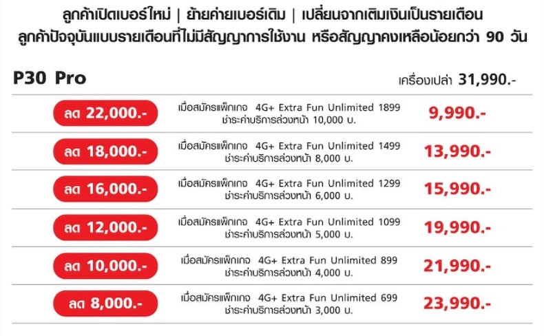 - ใช้แพ็กเกจหลักตั้งแต่ 899 บาทขึ้นไป ลดราคาค่าเครื่องเหลือ 19,990 บาท