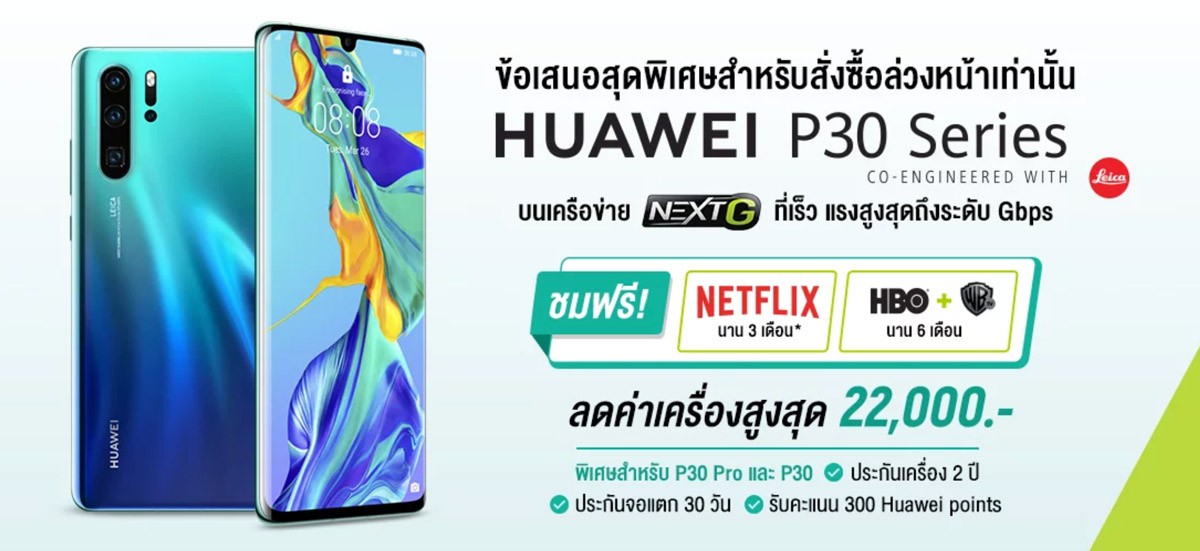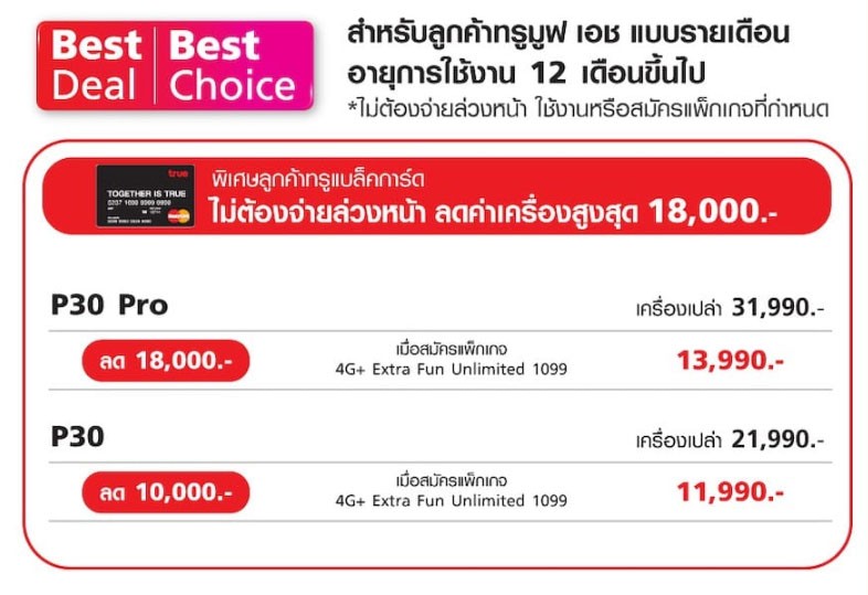 ลูกค้าสั่งจอ P30 Pro กับทรูมูฟ เอช วันที่ 28 มีนาคม – 8 เมษายน ราคาเครื่องเริ่มต้นเพียง 9,990 บาท พร้อมผ่อนชำระค่าบริการล่วงหน้า 0% นานสูงสุด 36 เดือน และยังได้สิทธิโทรฟรี ไม่อั้น 24 ชม. (ในเครือข่ายทรูมูฟ เอช), TrueID Unlimited HD ดูฟรี 12 เดือน และได้รับ True Point 1 คะแนน เมื่อซื้อสินค้าครบทุก 100 บาท