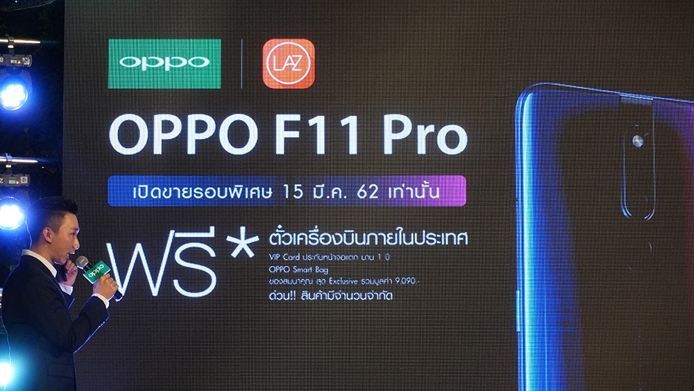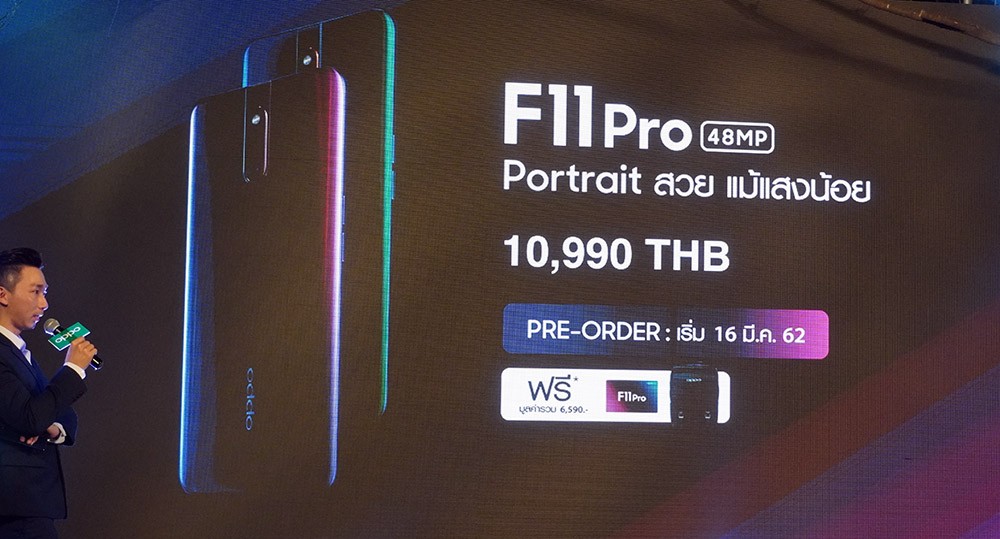 เปิดตัวพร้อมประกาศวันเปิดจองสินค้าล่วงหน้า OPPO F11 Pro ราคา 10,990 บาท จะเปิดให้จองตั้งแต่วันที่ 16 มีนาคมนี้ โดยจะได้รับสินค้าช่วงสิ้นเดือนมีนาคม โดยพิเศษ จะได้รับ F11 Pro VIP card รับประกันซ่อมจอแตกฟรี 1 ปี และกระเป๋าสะพาย
