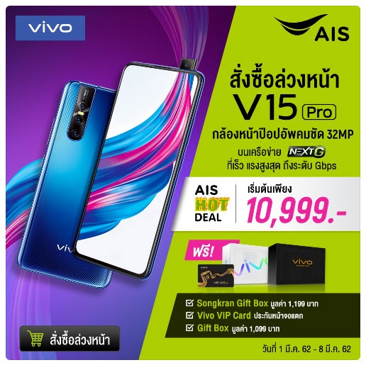 สำหรับทาง AIS มีโปรโมชั่นสั่งจอง Pre-order Vivo V15 Pro ในแคมเปญ AIS Hot Deal สั่งจองผ่านช่องทางออนไลน์ ตั้งแต่วันที่ 1-8 มีนาคม 2562 (สินค้าเริ่มจัดส่งวันที่ 9 มีนาคม) มีของแถมพิเศษให้เหมือนกับสั่งจองของทาง Vivo คือ Songkran Gift Box (มูลค่า 1,199 บาท), Vivo VIP Card ประกันหน้าจอแตกฟรี 1 ปี และ Gift Box (มูลค่า 1,099 บาท)