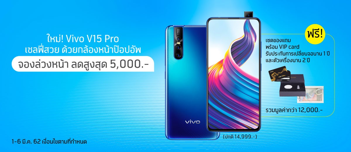 - Vivo V15Pro ราคาพิเศษ 9,999 บาท (ส่วนลด 5,000 บาท) เมื่อสมัครแพ็กเกจรายเดือน 899 (ชำระค่าบริการล่วงหน้า 2,500 บาท) ระยะสัญญา 12 เดือน