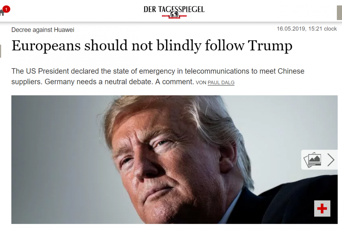 มีสื่อเยอรมนีได้ตีพิมพ์ในหัวเรื่องไว้ว่า “ยุโรปไม่ควรตาบอดตามทรัมป์” ซึ่งเป็นความเห็นที่ค้านกันกับกรณีสหรัฐอเมริกา กำลังต่อต้านบริษัทจากจีนทั้ง Hauwei และ ZTE ที่กำลังเกิดอยู่ในตอนนี้