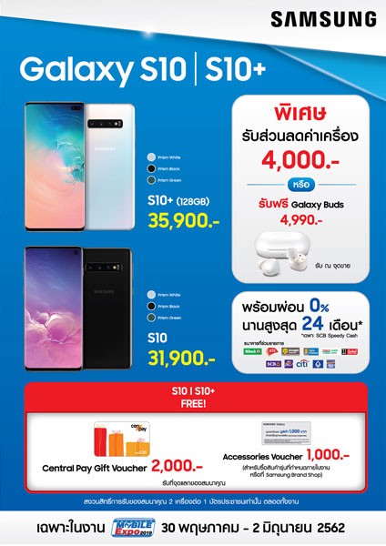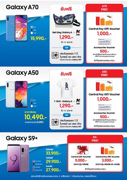 • Galaxy S10 และ S10+ (128GB) รับเพิ่ม Central pay Gift Voucher มูลค่า 2,000 บาท และ Accessories Voucher มูลค่า 1,000 บาท
