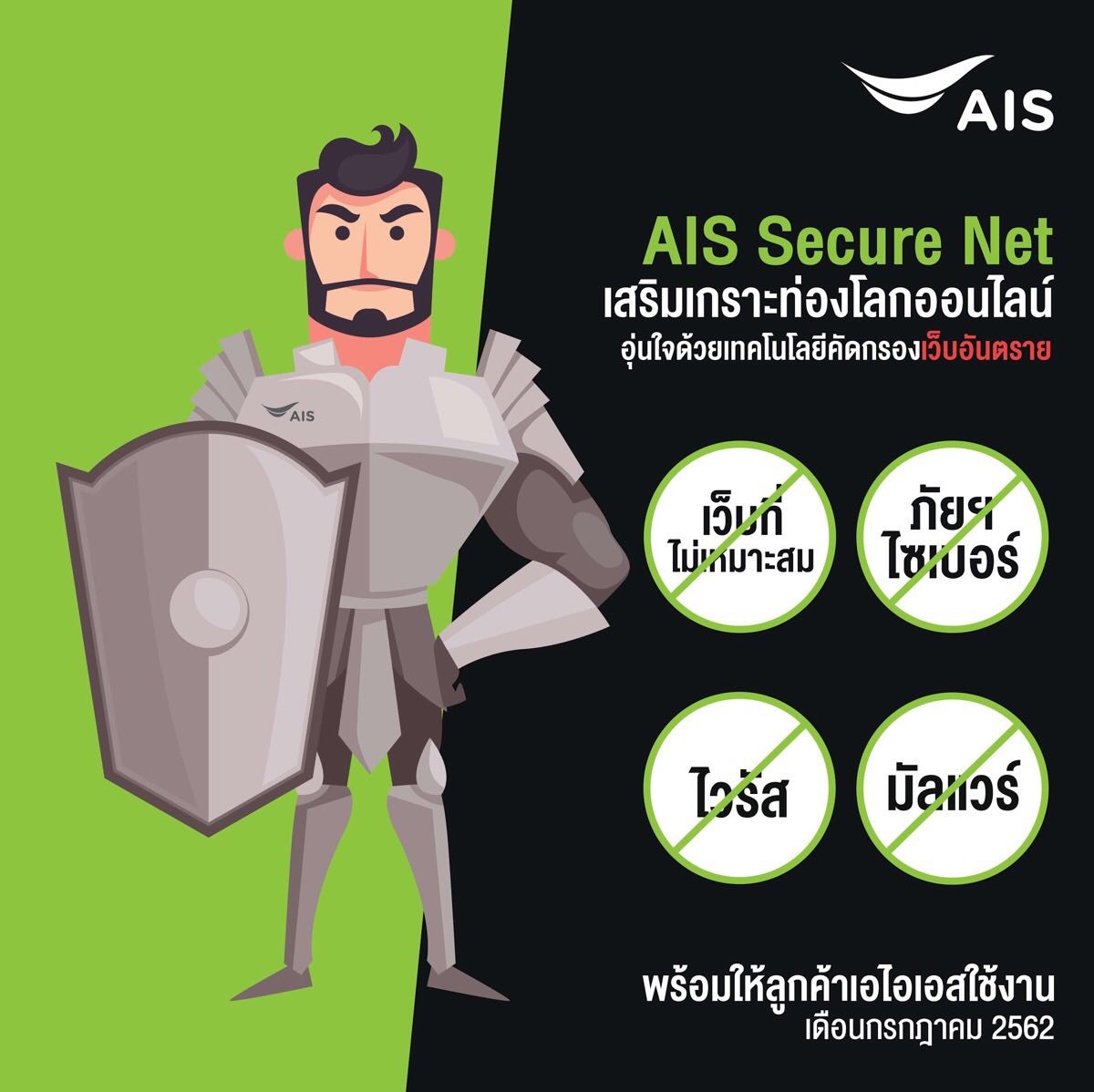 - เปิดตัว AIS Secure Net (Beta) ที่จะช่วยป้องกันและคัดกรองเนื้อหาบนโลกออนไลน์ ไม่ว่าจะเป็นเว็บ, ข้อความ รูปภาพ หรือวิดีโอที่ไม่เหมาะสม จากบุตรหลาน ในช่วงแรกนี้ เอไอเอสจะเปิดให้ลูกค้าได้ทดลองใช้บริการเป็น Beta Phase เชิญชวนลูกค้าเอไอเอสที่สนใจอยากใช้บริการ เข้ามาลงทะเบียนผ่านหน้าเว็บไซต์ เพื่อร่วมเป็น Pioneer ในการทดลองใช้บริการก่อนใคร จำนวน 10,000 คนแรก สามารถเข้ามาลงทะเบียนได้ตั้งแต่วันที่ 25 มิถุนายน 2562 และลูกค้ากลุ่มนี้ ก็จะได้ทดลองใช้บริการ AIS Secure Net ได้ตั้งแต่วันที่ 4 กรกฎาคม 2562 เป็นต้นไป