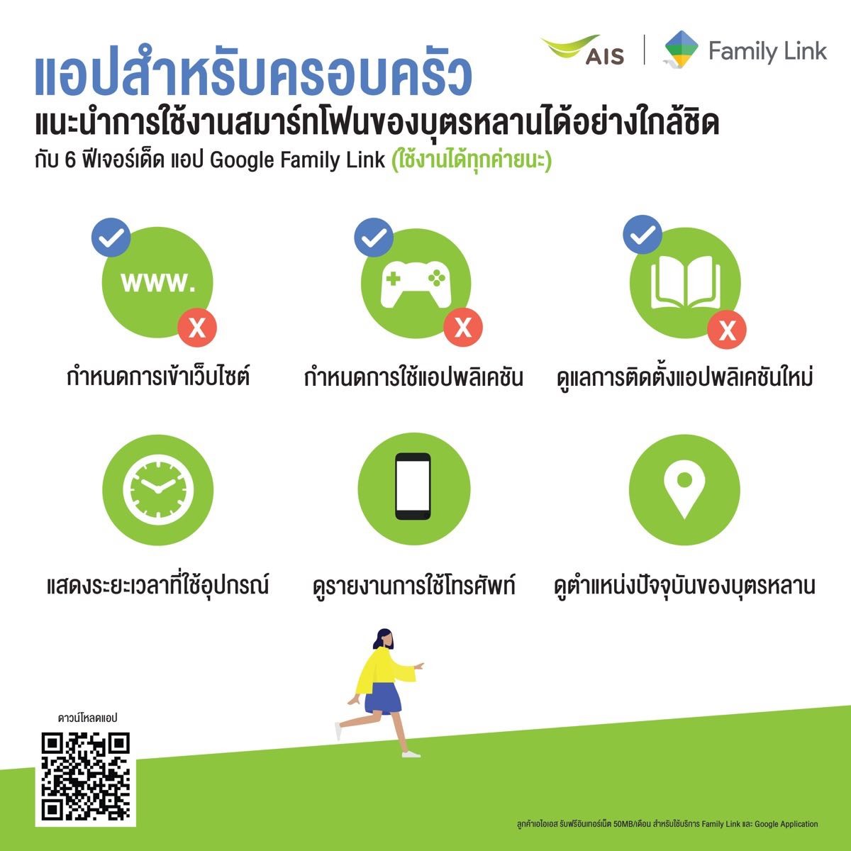- ร่วมมือกับ Google ในการนำบริการ Parental Control ผ่านแอปพลิเคชัน Google Family Link มาขยายผลสู่กลุ่มผู้ปกครองคนไทย (ใช้ได้ทุกเครือข่าย) ที่จะสามารถให้คำแนะนำ ดูแลการใช้งานโทรศัพท์ รวมถึงดูแลความปลอดภัยจากพิกัดปัจจุบันของบุตรหลานได้ง่ายๆ โดยเอไอเอส มอบอินเทอร์เน็ต on-top สำหรับการใช้งานให้ลูกค้าเอไอเอสสามารถดูแลบุตรหลานของท่านได้อย่างสบายใจ