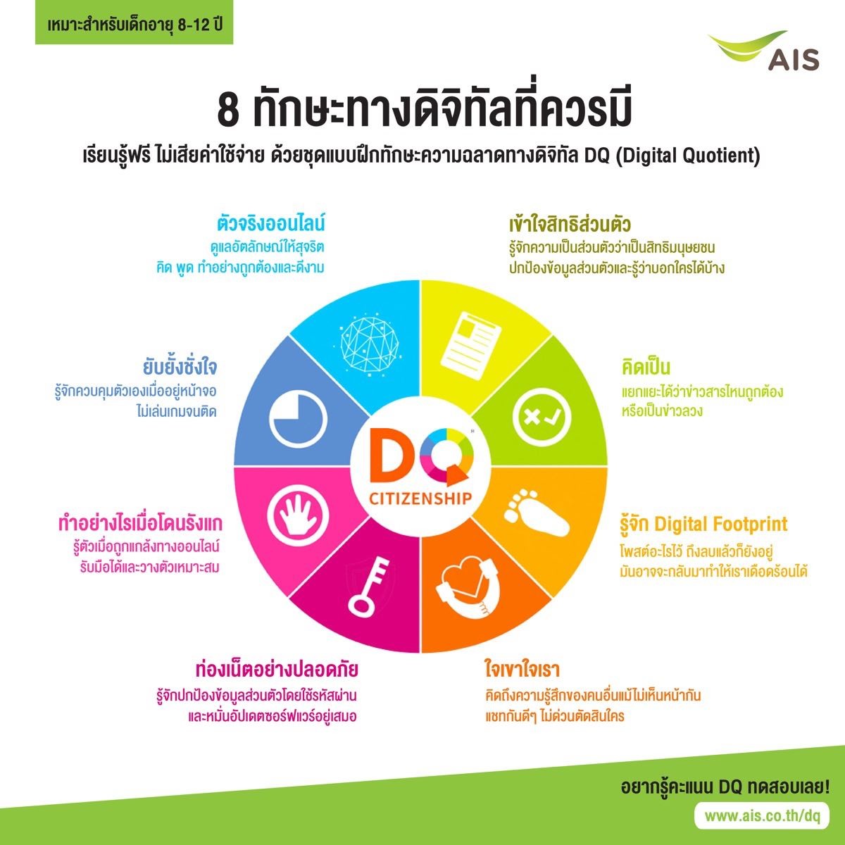 ขณะนี้ได้เริ่มขยายผลการสร้างทักษะความฉลาดทางดิจิทัล DQ (Digital Quotation) ไปสู่ภาคการศึกษาทั่วประเทศ รวมถึงเปิด Portal ศูนย์กลางการเรียนรู้สำหรับคนไทยทุกคน ที่โรงเรียน หรือ สถาบันที่ทำงานเพื่อพัฒนาเยาวชนต่างๆ สามารถเข้ามาใช้งานได้แล้ววันนี้ที่ www.ais.co.th/dq