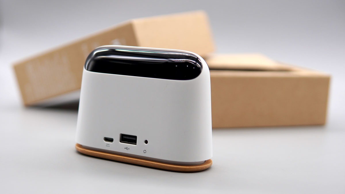 ส่วนที่ด้านหลังนั้นจะมีช่องพอร์ต Micro USB สำหรับเสียบไฟกับอแดปเตอร์ ต้องบอกว่ามันไม่มีแบตเตอรี่ภายในตัว จะต้องเสียบปลั้กเสียบสายเอาไว้ตลอดเวลา ถัดมาเป็นช่องพอร์ต USB เอาไว้สำหรับเสียบข้อมูลเพื่ออัพเกรด ส่วนสุดท้ายจะเป็นปุ่มรีเซ็ตการตั้งค่าการทำงาน
