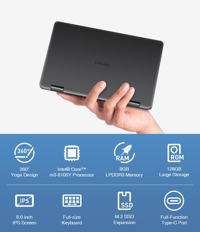 ตัวเครื่องมีขนาดหน้าจอ 8 นิ้ว 1920 x 1200 พิกเซล IPS สามารถกางหน้าจอได้ถึง 180 ใช้งานแบบ Convertible เป็นแท็บเล็ตได้