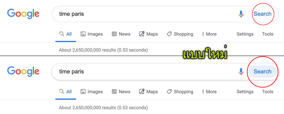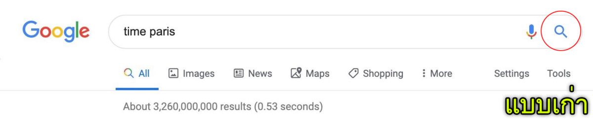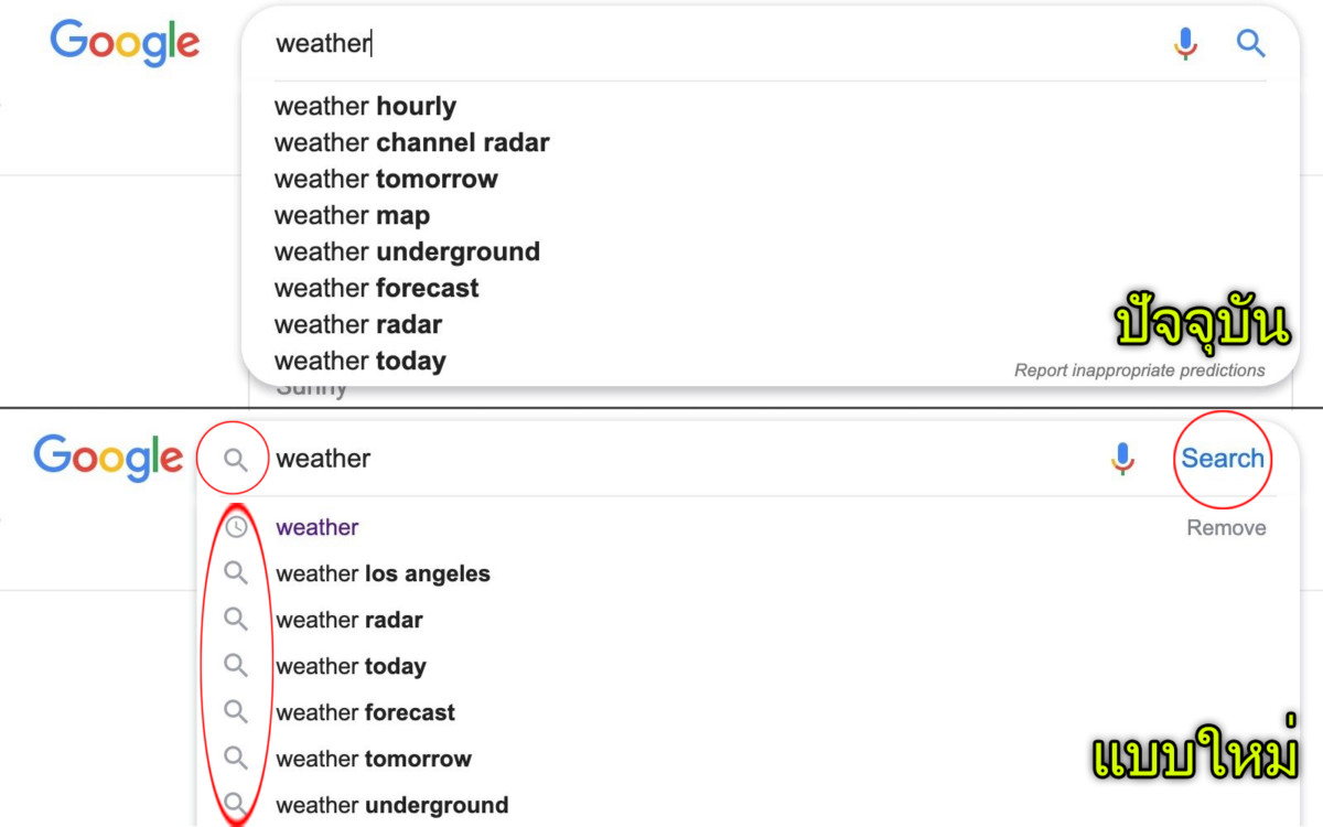 - แบบใหม่ที่ Google กำลังปรับ คือ จะมีไอคอนรูปแว่นขยายขึ้นด้วยในคำค้นหา และ คำค้นหาที่แนะนำ แต่ขึ้นเป็นแค่ไอคอน ไม่สามารถกดคลิ๊กเข้าไปได้ ถ้าจะคลิ๊ก ให้คลิ๊กที่คำว่า search แทน