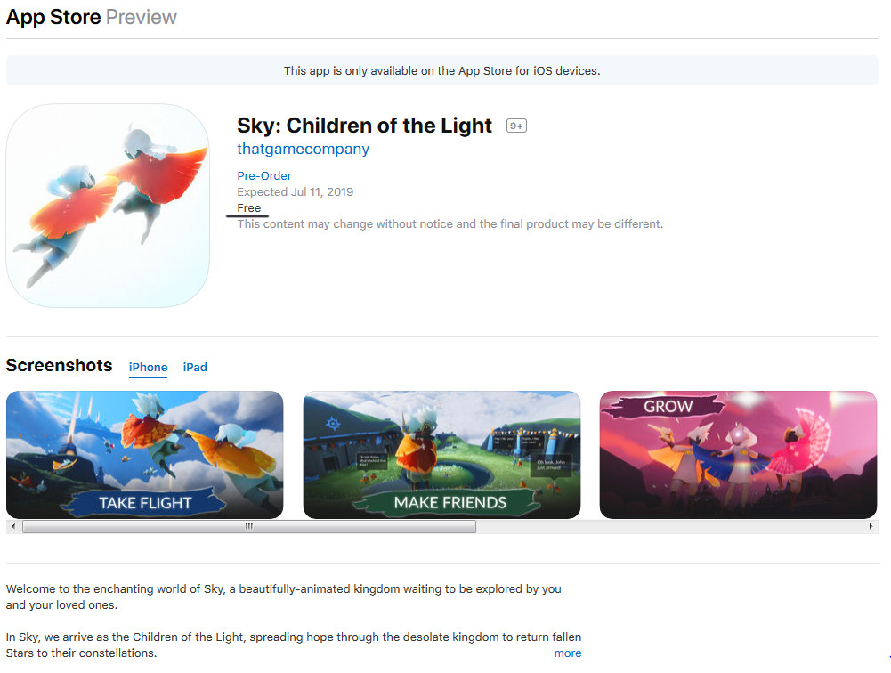 เกม Sky: Children of the Light จะเปิดให้ผู้ใช้งานของ Apple ได้เล่นก่อน ส่วนระบบปฏิบัติการ Android PC และ เกมคอนโซล นั้นคงต้องรอไปก่อน