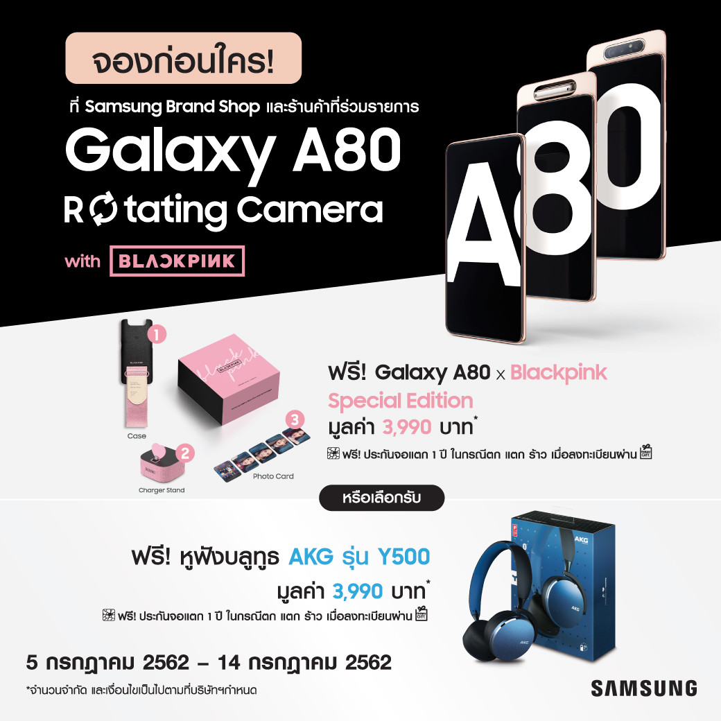 เมื่อสั่งซื้อ ซัมซุง กาแลคซี่ เอ 80 ผ่าน Samsung Brand Shop หรือร้านค้าที่ร่วมรายการ ตั้งแต่วันที่ 5 – 14 กรกฎาคม 2562 มีสิทธิ์เลือกรับของสมนาคุณสุดพิเศษ Galaxy A80 x Blackpink Special Edition มูลค่า 3,990 บาท ที่ไม่มีจำหน่ายที่ไหน จัดให้พิเศษเฉพาะงานนี้งานเดียวเท่านั้น โดยภายในเซ็ตประกอบด้วย