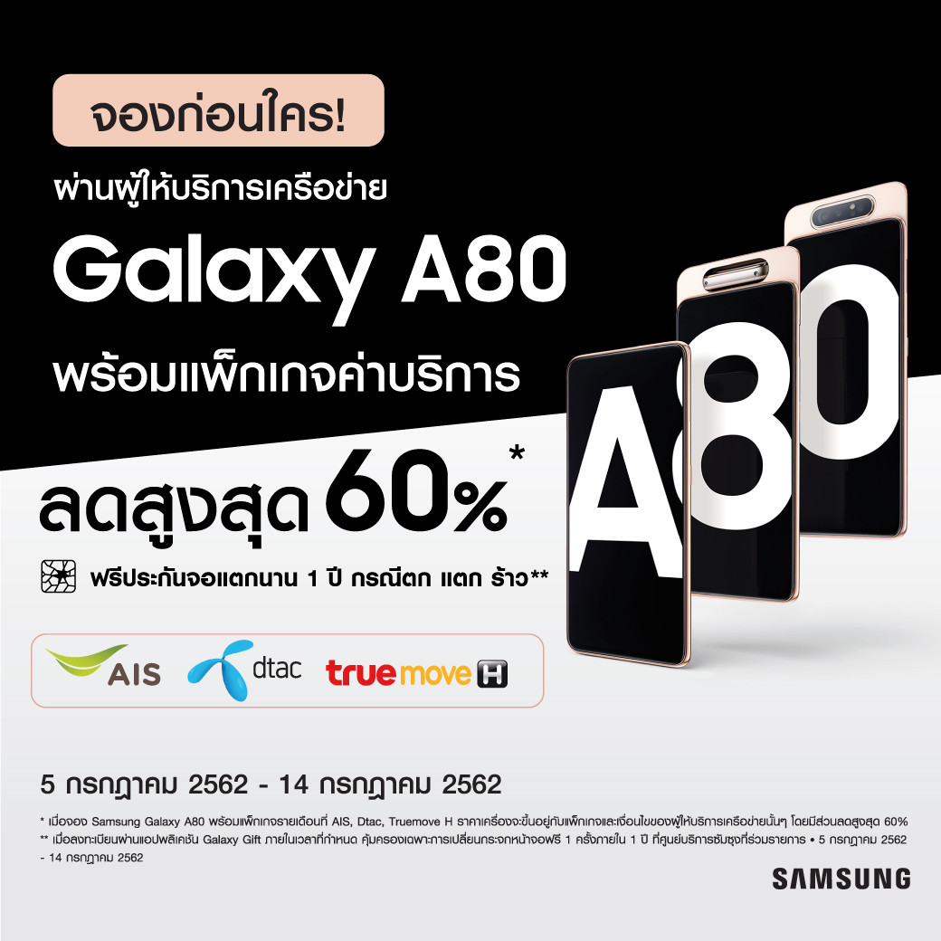 เปิดจองเพียง 3 วันเท่านั้น ตั้งแต่ 12- 14 กรกฎาคม 2562 ที่ Samsung Brand Shop ที่ร่วมรายการ หรือซื้อผ่านซัมซุงออนไลน์ช็อป (www.samsung.com/th/galaxy-a80-special) โดยจะรับของได้ตั้งแต่วันที่ 5 สิงหาคม 2562 เป็นต้นไป