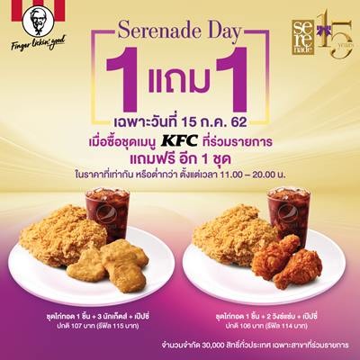 กลับมาอีกครั้งการ AIS Serenade Day ฉลอง เอไอเอส เซเรเนด ครบรอบ 15 ปี สำหรับวันที่ 15 กรกฎาคมนี้ อย่าพลาด สิทธิพิเศษสำหรับลูกค้าเซเรเนด รับสิทธิ์ซื้อชุดเมนู KFC ที่ร่วมรายการ 1 ชุด แถมฟรีอีก 1 ชุด (ในราคาที่เท่ากัน หรือต่ำกว่า)