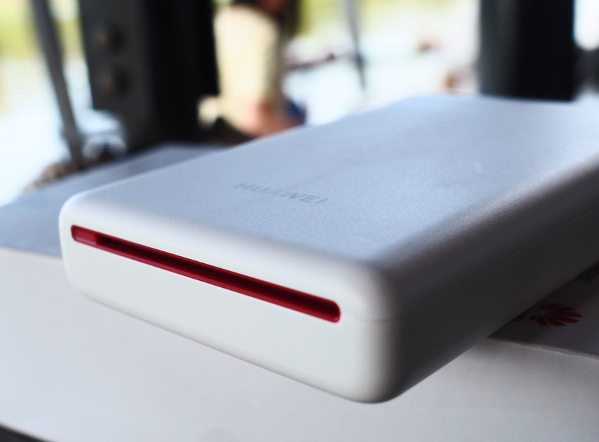 ตัว HUAWEI เครื่องพิมพ์ภาพพ็อกเก็ต ตัวเครื่องจะเป็นสีขาวเรียบๆ มีคำว่าหัวเว่ยอยู่ตรงหน้าแบบนี้เลย ออกแนวเรียบๆ แบบมินิมอลไปไหนก็ได้ พกพาสะดวก ส่วนด้านล่างจะเป็นช่องสำหรับปริ้นท์ภาพออกมา