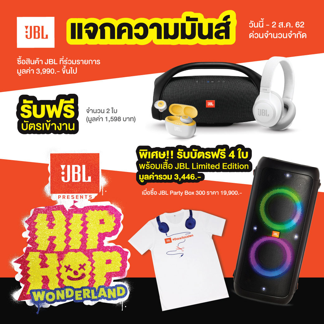 บริษัท มหาจักรดีเวลอปเมนท์ จำกัด จัดโปรโมชั่นเอาใจสายฮิปฮ็อป เมื่อซื้อสินค้าที่ร่วมรายการมูลค่า 3,990 บาท ขึ้นไป ที่ร้านตัวแทนจำหน่าย รับฟรี! บัตรเข้างาน JBL Presents Hip-Hop Wonderland หรือ* ซื้อ JBL Party Box 300 ราคา 19,900 บาท ก็รับไปเลยบัตรเข้างาน Hip-Hop Wonderland ฟรีๆ 4 ใบ! แถมเสื้อ JBL Limited Edition ให้ไปใส่หล่อๆ ฟรีอีก 1 ตัว เพียงซื้อสินค้าและลงทะเบียนรับบัตรที่ Line @mahajaklife