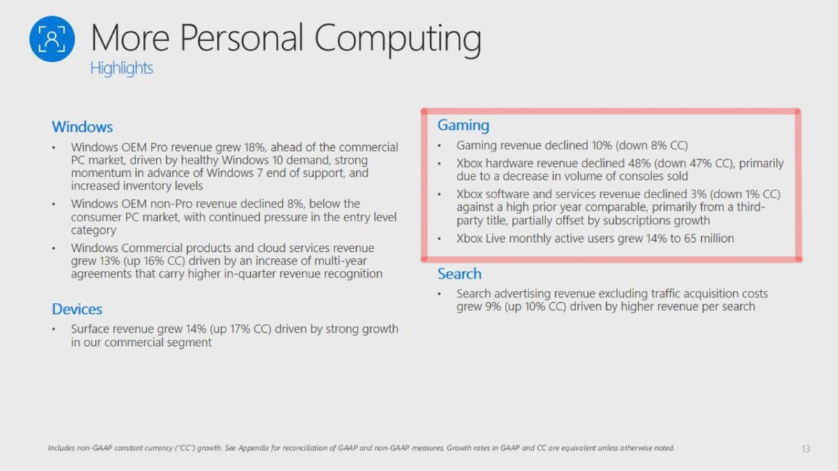 การที่รายได้ฝั่งเกมร่วงลงกว่าเดิม ก็ไม่น่าแปลกใจอะไร เพราะ ทางบริษัทฯเองก็ยังไม่ได้เปิดตัวเครื่องเกมใหม่ ซึ่ง Microsoft เองก็คาดว่าจะเปิดตัว Xbox รุ่นใหม่ปีหน้า (ในงาน E3 เดือนมิถุนายนที่ผ่านมา Microsoft ทดสอบระบบใหม่ ที่มี codename ว่า ” Project Scarlett ” ซึ่ง Microsoft กล่าวไว้ว่า มันจะแรงกว่า Xbox One X ถึง 4 เท่าตัวเลยทีเดียว)
