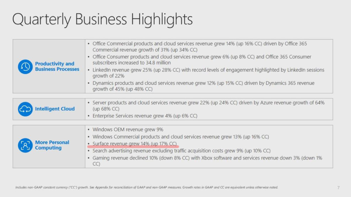 อีกจุดนึงที่น่าสนใจ คือ รายได้ฝั่ง Personal Computing ของ Surface เองโตขึ้นถึง 14% เลยทีเดียว ซึ่งหลักๆนั้น ทางบริษัทได้มากจากกลุ่มลูกค้าประเภทลูกค้าองค์กรที่เพิ่มขึ้น
