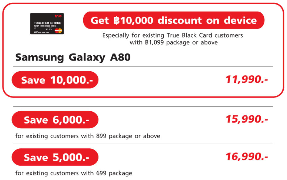 TrueMove H จัดส่วนลดพิเศษสำหรับ Samsung Galaxy A80 สำหรับผู้ที่สั่งจองล่วงหน้า วันที่ 5-14 กรกฎาคม (มัดจำ 500 บาท) โดยจะได้รับส่วนลดค่าเครื่องสูงสุด 13,100 บาท เมื่อสมัครแพ็กเกจ 4G+ Extra Fun Unlimited ตามที่กำหนด พร้อมได้รับชมคอนเทนต์บันเทิงผ่าน TrueID ฟรี 12 เดือน และรับประกันหน้าจอแตก 1 ปี เมื่อลงทะเบียนรับสิทธิผ่าน Galaxy Gift (ดูรายละเอียดได้ที่นี่)