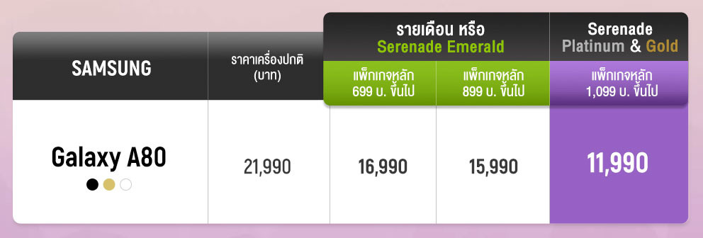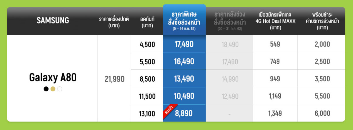 Samsung Galaxy A80 รับส่วนลดค่าเครื่องพิเศษ เมื่อซื้อเครื่องพร้อมสมัครแพ็กเกจ 4G Hot Deal MAXX สำหรับลูกค้าเปิดเบอร์ใหม่, ย้ายค่ายเบอร์เดิม, เปลี่ยนจากเติมเงินเป็นรายเดือน และลูกค้าปัจจุบันในระบบรายเดือน รับส่วนลดค่าเครื่องสูงสุด 13,100 บาท เหลือเพียง 8,890 บาท แถมได้รับสิทธิชมฟรี HBO, WBTV ไม่คิดค่าเน็ต นาน 6 เดือน