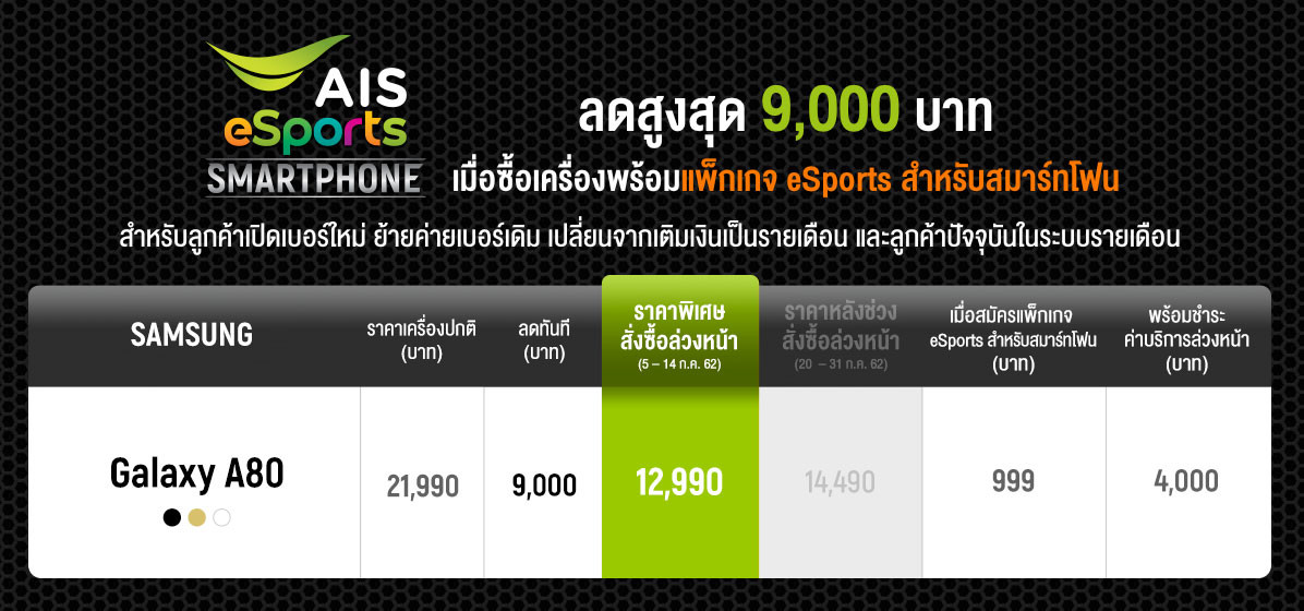AIS eSports Smartphone รับส่วนลดค่าเครื่องสูงสุดถึง 9,000 บาท (ชำระค่าบริการล่วงหน้า 4,000 บาท) เมื่อซื้อเครื่องพร้อมแพ็กเกจ eSports สำหรับสมาร์ทโฟน (รายเดือน 999 บาท ใช้ Next G, Internet สำหรับเล่นเกม, LINE, Facebook, AIS Super WiFI ไม่จำกัด, อินเทอร์เนต 4G/3G 25GB โทรฟรีทุกเครือข่าย 300 นาที และรับไอเทมเกมสุดพิเศษ)