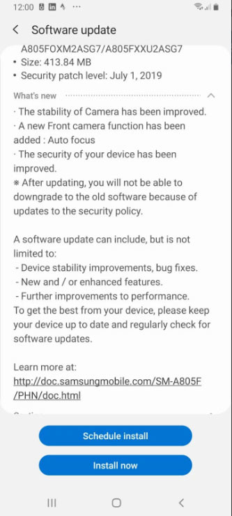 ในการอัพเดทซอฟ์ทแวร์เวอร์ชั่น A805FXXU2ASG7 ที่นอกจากจะมีตัว July 2019 security patch ด้านความปลอดภัยการใช้งานแล้ว ยังมีเพิ่มฟีเจอร์และการปรับสมดุลการใช้งานให้ดียิ่งขึ้น โดยเฉพาะส่วนของกล้องหน้าได้ใส่ความสามารถในการปรับโฟกัสภาพอัตโนมัติเพิ่มให้มาด้วย