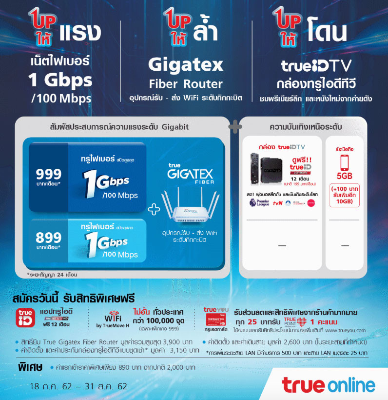 - ค่าบริการ 899 บาท ได้ Trueonline ความเร็ว 1Gbps/100Mbps และ TrueID Ultimate Package ฟรี 12 เดือน (ติดสัญญาการใช้งาน 24 เดือน)