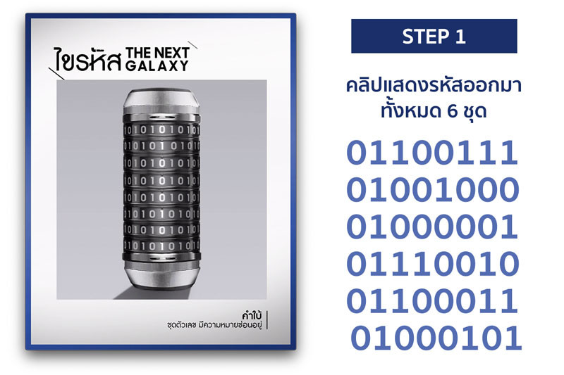 คลิปวิดีโอสั้น 10 วินาที แสดงเป็นตัวเลขฐาน 2 แบบ Binary Code จำนวน 6 ตัว ที่ถอดรหัสออกมาแล้วเรียงตัวอักษรใหม่เป็นคำว่า “Charge”