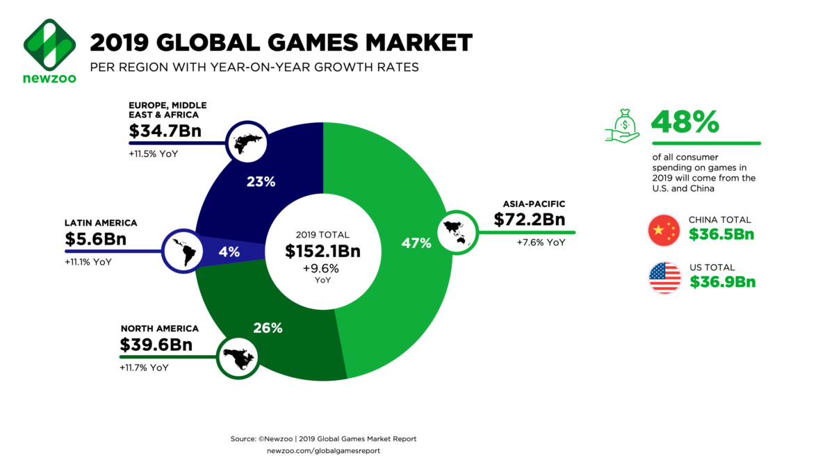 นอกจากนั้นยังมีตัวเลขตลาดเกมบนอุปกรณ์พกพา ที่กลายมาเป็นแพล็ตฟอร์มที่มีผู้เล่นมากที่สุดในโลก ส่วนแบ่งตลาดสูงถึง 45 เปอร์เซ็นต์ ในปี 2019 นี้