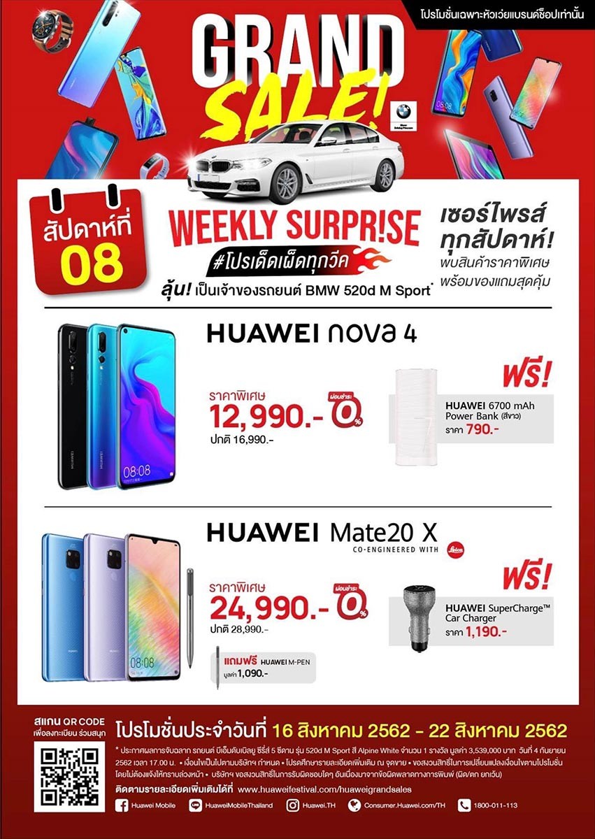 HUAWEI Grand Sales 2019 โปรโมชั่นสุดยิ่งใหญ่จากหัวเว่ย ที่จัดให้อย่างจุใจตลอด 2 เดือนเต็ม ตั้งแต่ ปลายเดือนมิถุนายนที่ผ่านมา ปีนี้จัดหนักจัดเต็มกว่าเดิม โดยขนทัพสมาร์ทโฟน แท็บเล็ต และแก็ดเจ็ตหัวเว่ยเกือบทุกรุ่นมาร่วมรายการในราคาพิเศษ พร้อมของสมนาคุณสุดพรีเมียม พร้อมรับสิทธิ์ผ่อน 0% นานสูงสุด 36 เดือน และ ลุ้นเป็นเจ้าของรถยนต์สุดหรู “BMW 520d M sport” มูลค่ากว่า 3.5 ล้านบาท