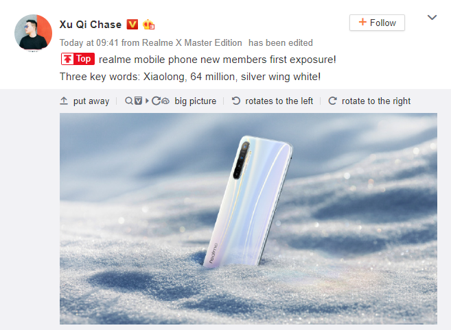 Xu Qi Chase ผู้บริหารตำแหน่ง CMO ของ realme ได้โพสต์รูป Teaser ของสมาร์ทรุ่นใหม่ตัวต่อไปให้เราได้เห็นกัน ซึ่งจากด้านหลัง ก็จะเหมือนกันกับเครื่อง realme 5 ตัวปัจจุบันเลย มาพร้อมกล้อง 4 ตัวเรียงเป็นแนวตั้ง