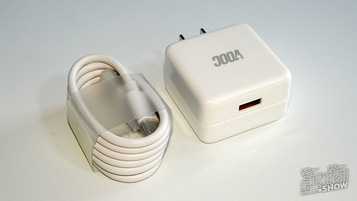 ทางด้านตัวหัวชาร์จอแดปเตอร์ จะเป็นตัวรองรับมาตรฐานการชาร์จเร็ว VOOC 3.0 Fast Charging ที่ระดับ 20W (5V 4A) ซึ่งในเครื่องตัวอย่างที่เราได้มาตัวขาเสียบจะมีความต่างกันเล็กน้อย คือมีเป็นแบบขาแบน และขากลม