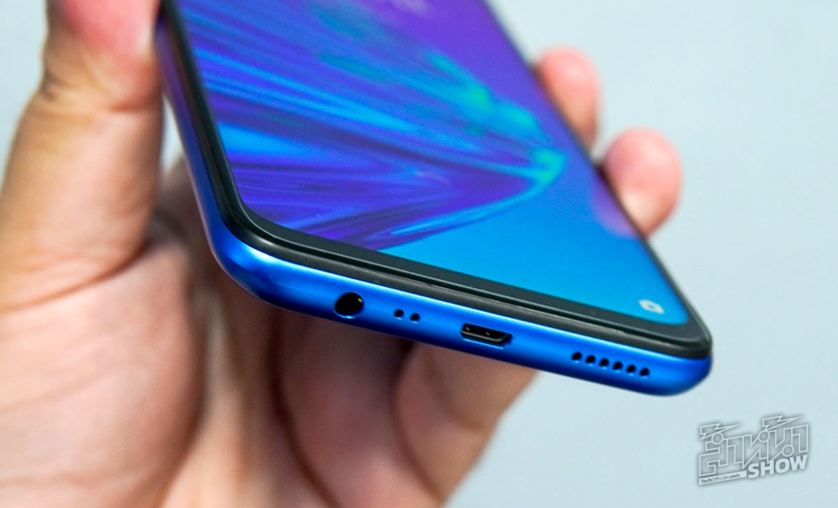 ตำแหน่งของปุ่มกดต่างๆ วางไว้เหมือนกับรุ่นโปร ทั้งปุ่ม Power ที่ด้านขวา ปุ่มปรับระดับเสียงด้านซ้าย พร้อมช่องใส่ซิมแบบ Triple Tray ส่วนด้านล่างจะมีพอร์ตหูฟัง, ไมค์สนทนา, ลำโพง จะมีจุดต่างจากรุ่นโปรตรงที่ realme 5 จะใช้พอร์ตเป็น Micro USB แต่ก็รองรับระบบชาร์จเร็ว VOOC 3.0 เหมือนกัน ทำให้การชาร์จแบตเตอรี่ขนาด 5,000 mAh นั้นทำได้รวดเร็วกว่าสมาร์ทโฟนทั่วไป