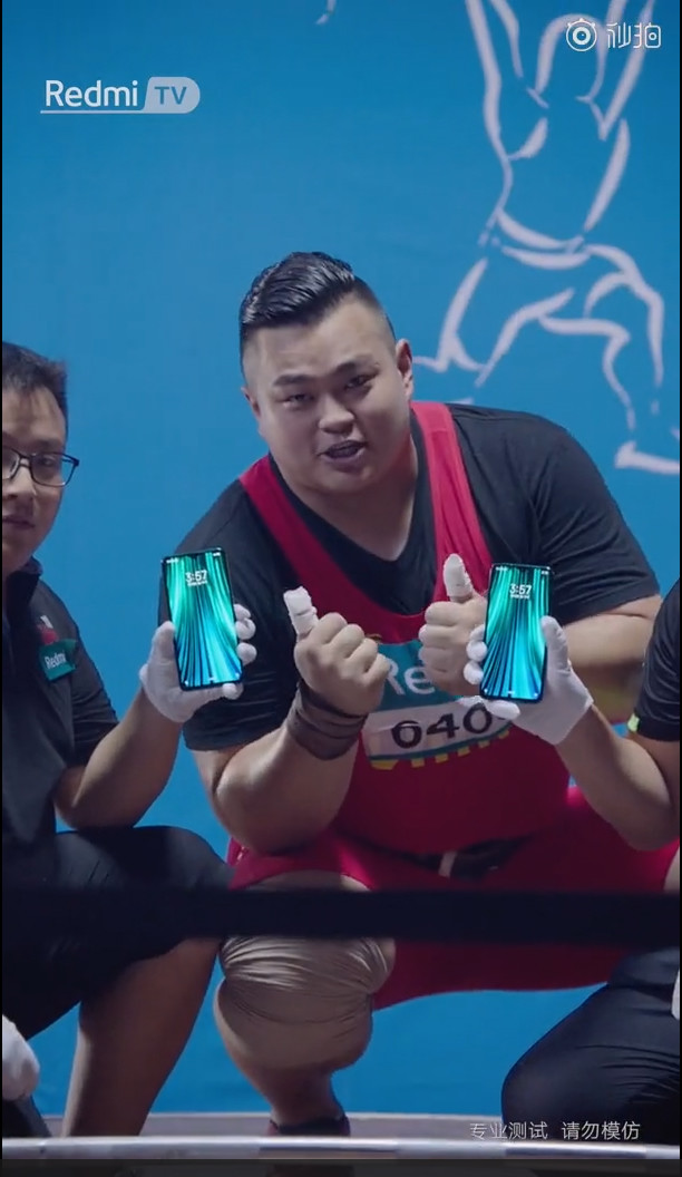จากวิดีโอตัวล่าสุดบนบัญชี Weibo ของแบรนด์ Xiaomi เป็นการทดสอบความแข็งแรงทนทาน ของ Redmi Note 8 Pro โดย วางสมาร์ทโฟน 2 เครื่องไว้ที่พื้น จากนั้น ให้นักยกน้ำหนักเหยียบบนสมาร์ทโฟนทั้ง 2 เครื่อง แล้วยกท่าสแนทช์ ที่น้ำหนัก 90 กิโลกรัม