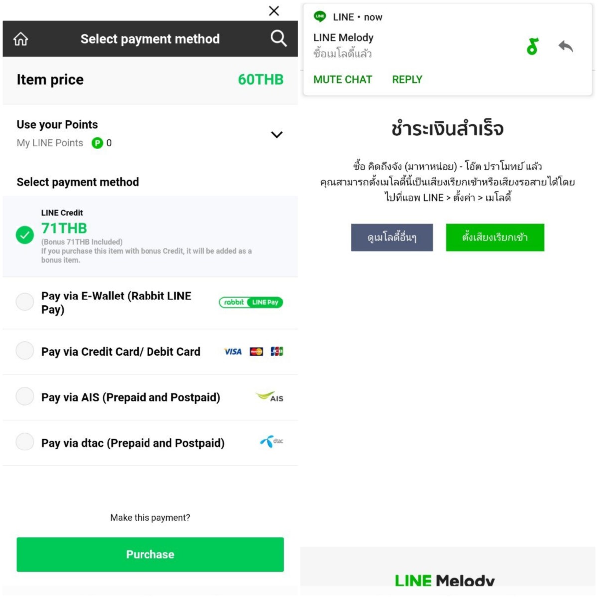 พอเรากดซื้อปุ๊ป มันจะขึ้นมาหน้าจอให้เลือกช่องทางการจ่ายเงิน ที่มีให้เลือกมากมาย ไม่ว่าจะเป็นการจ่ายเงินโดย LINE Credit, rabbit LINE Pay, ตัดบัตรเครดิต ,จ่ายผ่านโอเปอเรเตอร์เครือข่ายมือถือ ได้ทั้ง AIS หรือ Dtac