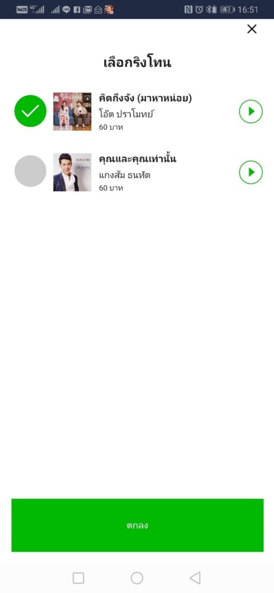 หลังจากที่เรากดเข้าไปในหน้า Ringtone เราก็จะสามารถเลือกเพลงที่เราซื้อไว้ได้มาเป็นเสียงรอสายได้เลย หลังจากนี้เวลาที่ใครโทรหาเรา ก็จะมีเสียงรอสายLINE Melody เป็นเพลงที่เราเลือกซื้อไว้