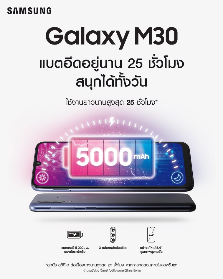 กาแลคซี่ เอ็ม 30 เปิดตัวพร้อมสเปคที่ครบครัน ไม่ว่าจะเป็นแบตเตอรี่ความจุถึง 5000 mAh สามารถใช้งานต่อเนื่องได้ยาวนานถึง 25 ชั่วโมง ทั้งยังรองรับการชาร์จเร็วด้วยระบบ Fast Charging ให้คุณสนุกต่อได้ทันใจ บนหน้าจอแสดงผล Super AMOLED Infinity-U ขนาดใหญ่ถึง 6.4 นิ้ว ให้คุณได้เต็มอิ่มกับจอใหญ่สีสันสดใสคมชัด และที่สำคัญที่สุดคือกล้องหลังอัจฉริยะ 3 ตัว ให้คุณถ่ายภาพด้วยเลนส์มุมกว้าง Ultra Wide 123 เก็บครบทุกมุมมองในราคาที่จับต้องได้เพียง 6,990 บาทเท่านั้น