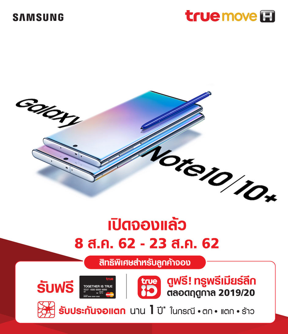 - เริ่มด้วยลูกค้าทุกคนที่จอง Galaxy Note10 และ Note10+ กับทรูมูฟ เอช จะได้รับประกัน หน้าจอแตก นาน 1 ปี (กรณี ตก แตก ร้าว) ใช้งานสบายใจไม่ต้องห่วงเรื่องจอแตกไปได้เลย