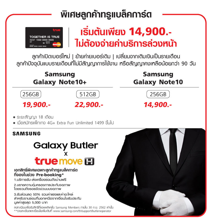 - สำหรับลูกค้าย้ายค่ายเบอร์เดิม จอง Galaxy Note10 และ Note10+ กับทรูมูฟ เอช จะได้ลดค่าเครื่องเพิ่มอีก 1,000 บาท