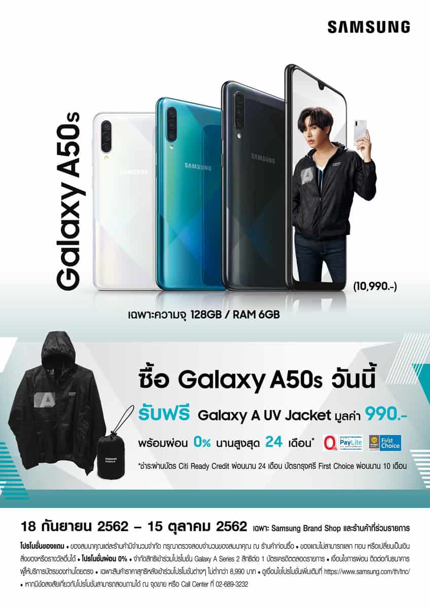 สำหรับผู้ที่ซื้อ Galaxy A50s รุ่นความจุ 128 กิกะไบต์ แรม 6 กิกะไบต์ ระหว่างวันที่ 18 กันยายน – 15 ตุลาคม 2562 รับสินค้าสุดเอ็กซ์คลูซีฟ Galaxy A UV Jacket มูลค่า 990 บาท พร้อมรับสิทธิ์ผ่อน 0% นานสูงสุด 24 เดือน เมื่อชำระด้วยบัตร Citi Ready Credit Card หรือเลือกผ่อน 0% นาน 10 เดือน เมื่อชำระสินค้าด้วยบัตรกรุงศรีเฟิร์สช้อยส์ เฉพาะที่ Samsung Brand Shop และร้านค้าที่ร่วมรายการ สามารถติดตามรายละเอียดเกี่ยวกับสิทธิพิเศษเพิ่มเติมได้ที่ http://www.samsung.com/th/galaxy-a50s/