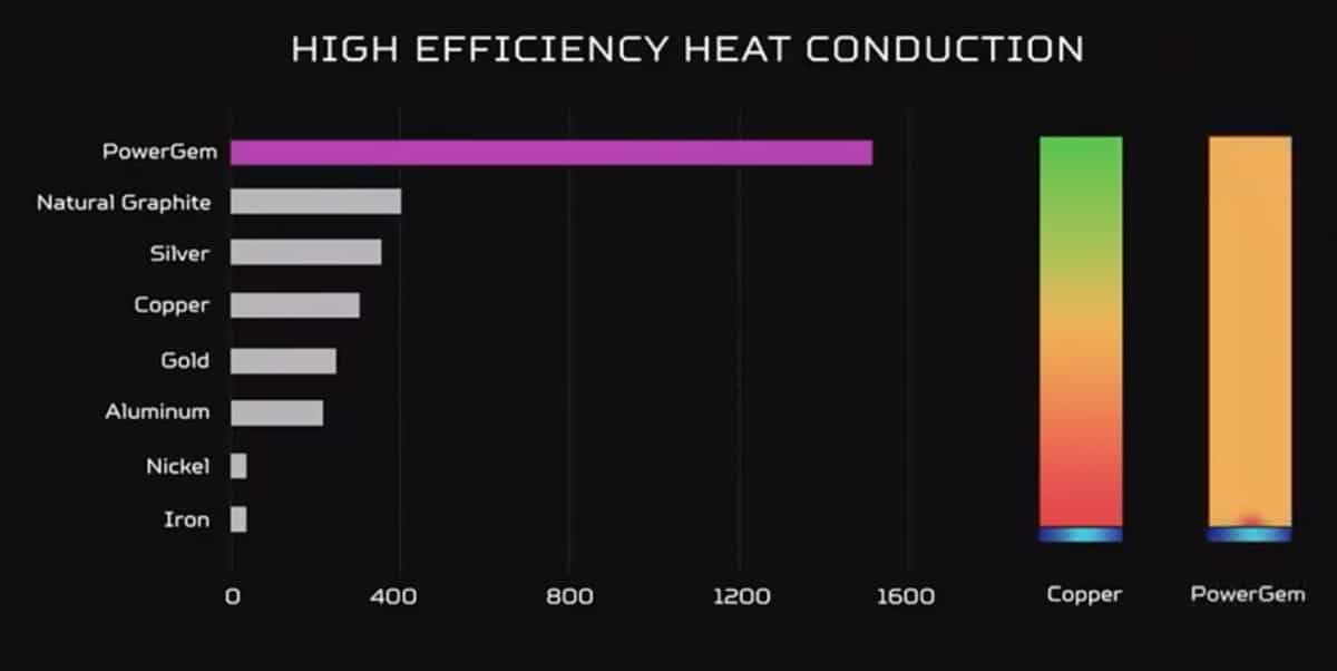 จากข้อมูลที่เอามาโชว์ บอกว่าเจ้า PowerGem นี้ สามารถนำความร้อนได้ดีกว่าทองแดงถึงกว่า 4 เท่า ส่งผลให้สามารถใช้กำลังไฟได้มากขึ้นอีกถึง 77 เปอร์เซ็นต์ ส่งผลให้ตัว CPU ทำงานได้เร็วขึ้นอีก 12.5 เปอร์เซ็นต์