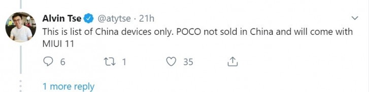 หัวเรือใหญ่ของ Pocophone Global, Alvin Tse ออกมาให้ข้อมูลผ่านทวีตเพิ่มเติมว่า รายชื่อที่ประกาศนั้น เป็นรายชื่อเฉพาะรุ่นเครื่องที่มีจำหน่ายในจีนเท่านั้น ดังนั้นจึงไม่มีชื่อของ Pocophone รวมอยู่ด้วย เพราะไม่ได้จำหน่ายในจีน