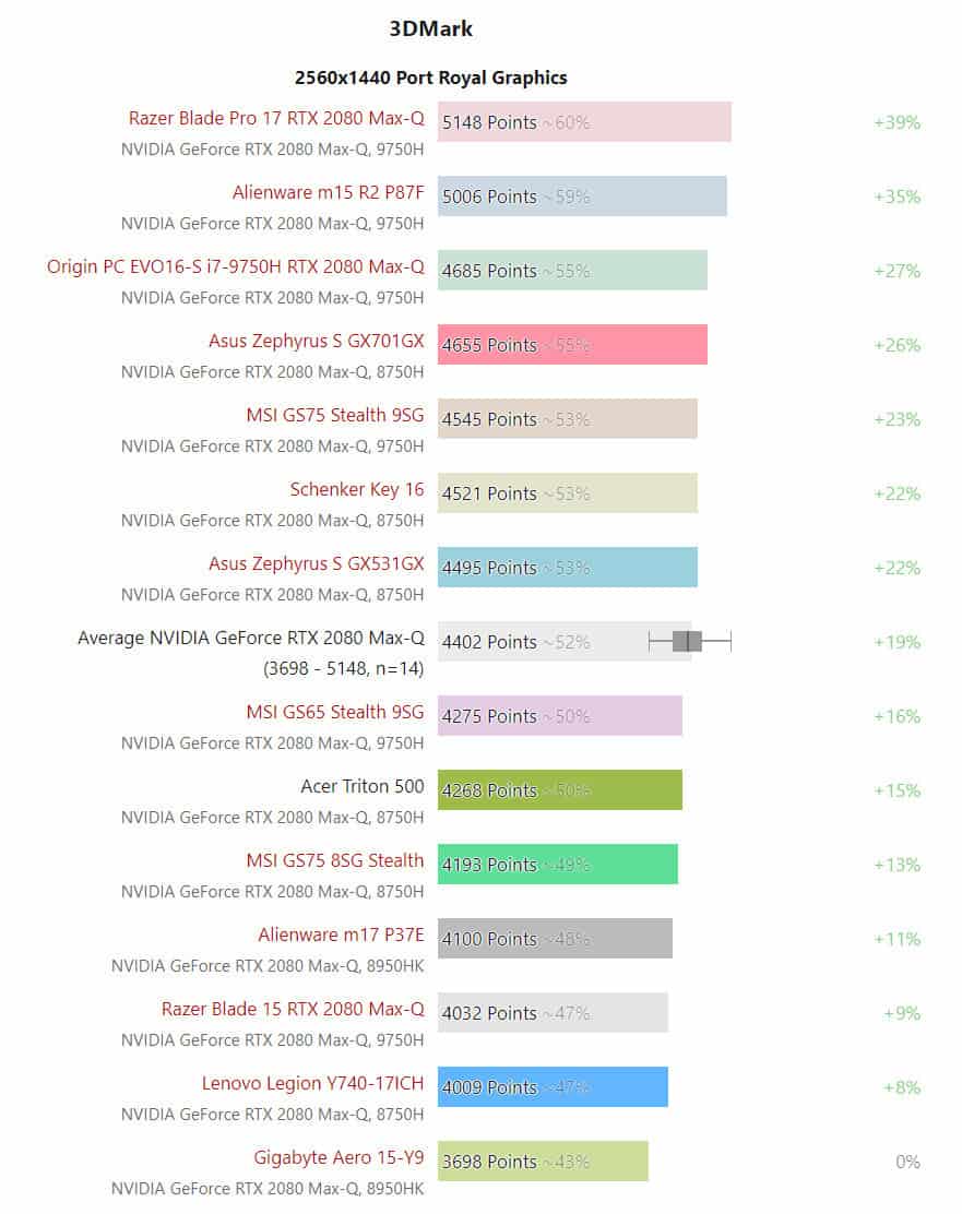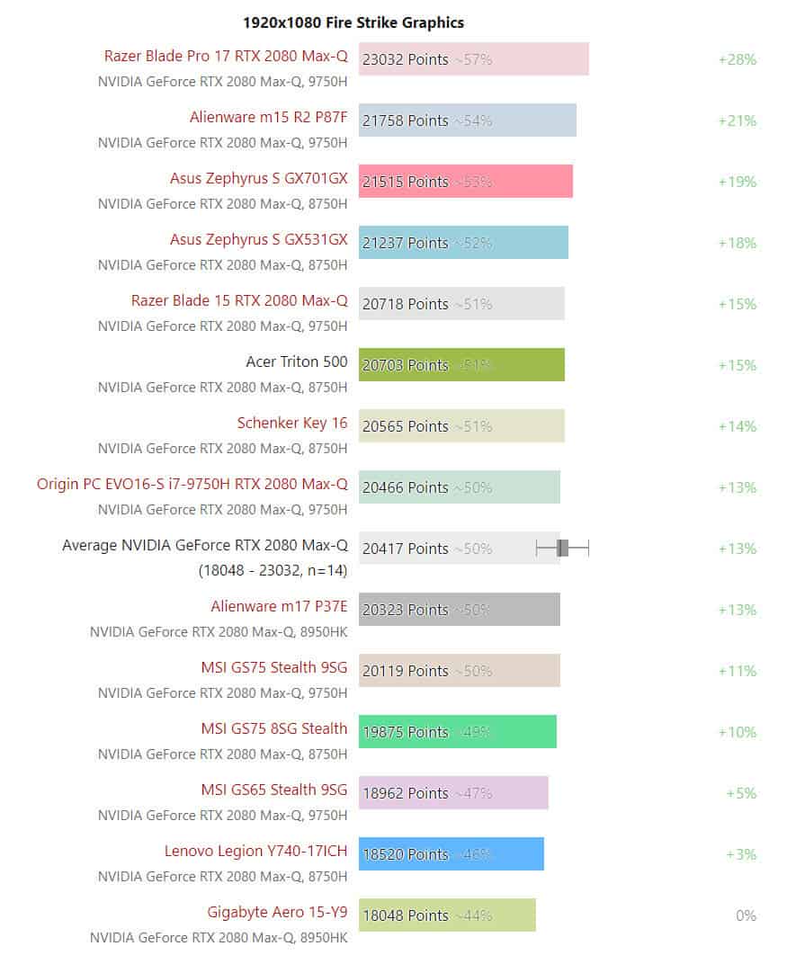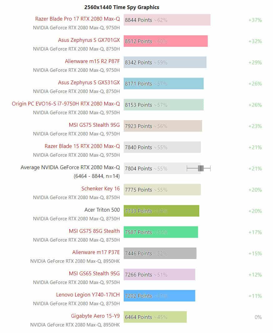 เว็บไซต์ Notebookcheck ได้จับเอาเครื่องโน้ตบุ๊กเกมมิ่งที่ใช้การ์ดจอตัวแรงใหม่สุดนี้มาทดสอบวัดผลคะแนนให้ดูกัน ด้วยโปรแกรม 3DMark ผลปรากฎว่า Razer Blade Pro 17 คือเครื่องที่แรงที่สุด ส่วนตัวที่ช้าที่สุดคือ Gigabyte Aero 15-Y9