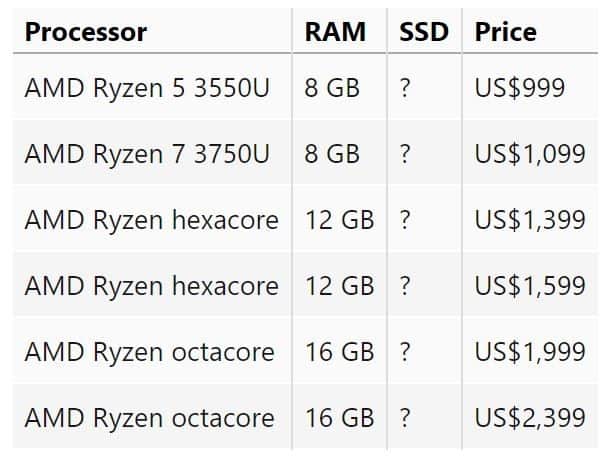 รุ่นเริ่มต้นราคาถูกสุด จะเป็นชิป AMD Ryzen 5 3550U พร้อมแรมนาด 8 GB ที่ราคา $999 ประมาณ 30,500 บาท ตามมาด้วย AMD Ryzen 7 3750U พร้อมแรมขนาดที่เท่ากัน ราคา $1,099 ประมาณ 33,600 บาท